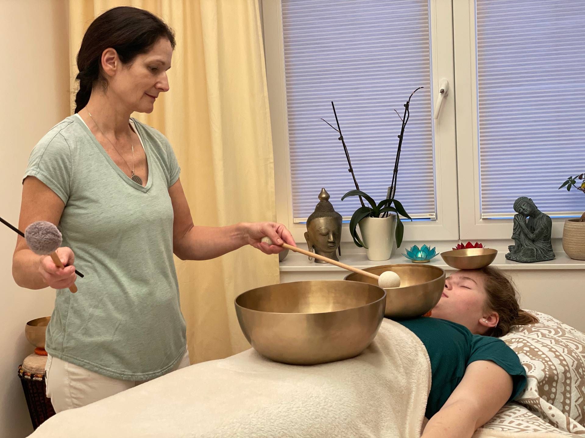 Mit Klangschalen lassen sich Klangräume erzeugen, die innerhalb einer Meditation den Körper in eine vertiefte Entspannung führen können. Die sorgsame Auswahl und das Arrangieren der Schalen unterstützen diesen Prozess.
